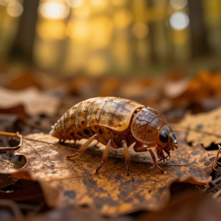 Chitin exoskeleton insects crawling over decaying autumn leaves, hyperrealistic detail of the shell segmentation and texture, warm golden hour sunlight filtering through forest canopy