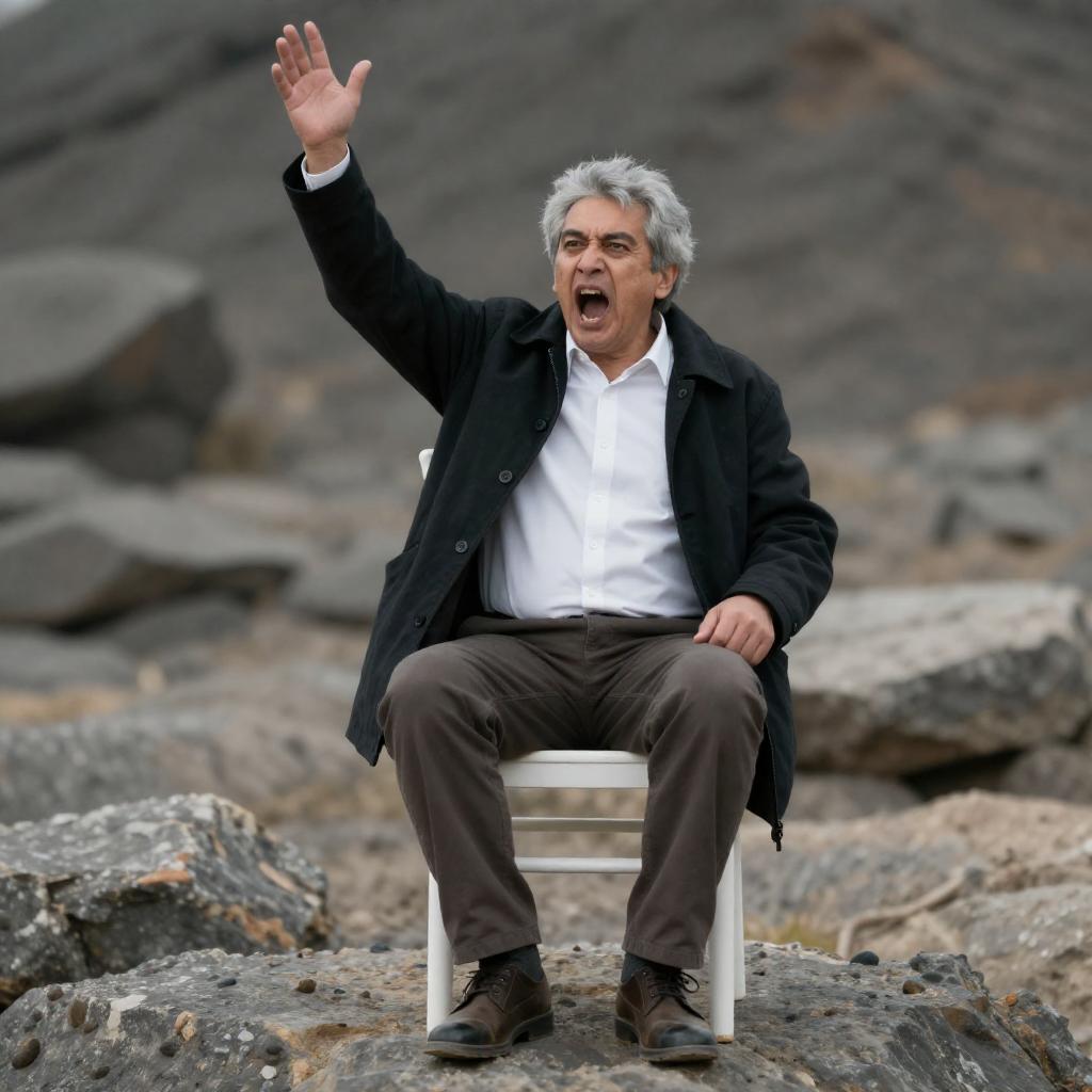 Photograph of a middle-aged man with curly dark hair, wearing gold-framed glasses, an orange life jacket, and gray sweatpants. He is seated in a yellow boat, with dark blue water in the background. His mouth is open in a shout. His hands grip the boat's edge. The life jacket has a white emblem on the front. The boat has metal parts and ropes visible. The man's expression is intense and vocal.