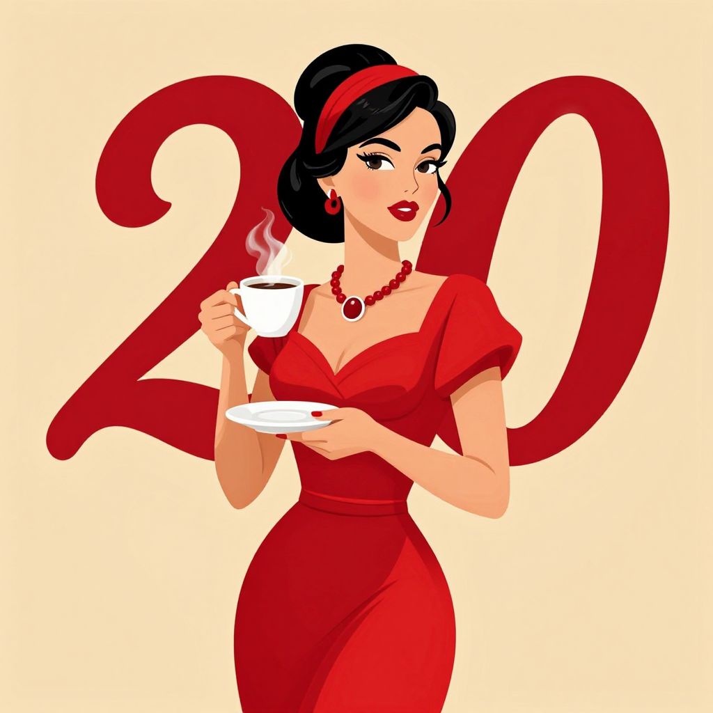 Elegant retro-style illustration of a woman in a vibrant red dress, adorned with a matching headband and necklace, gracefully holding a steaming cup of coffee on a saucer, set against a warm beige background with the number \"20\" prominently displayed in bold red script.