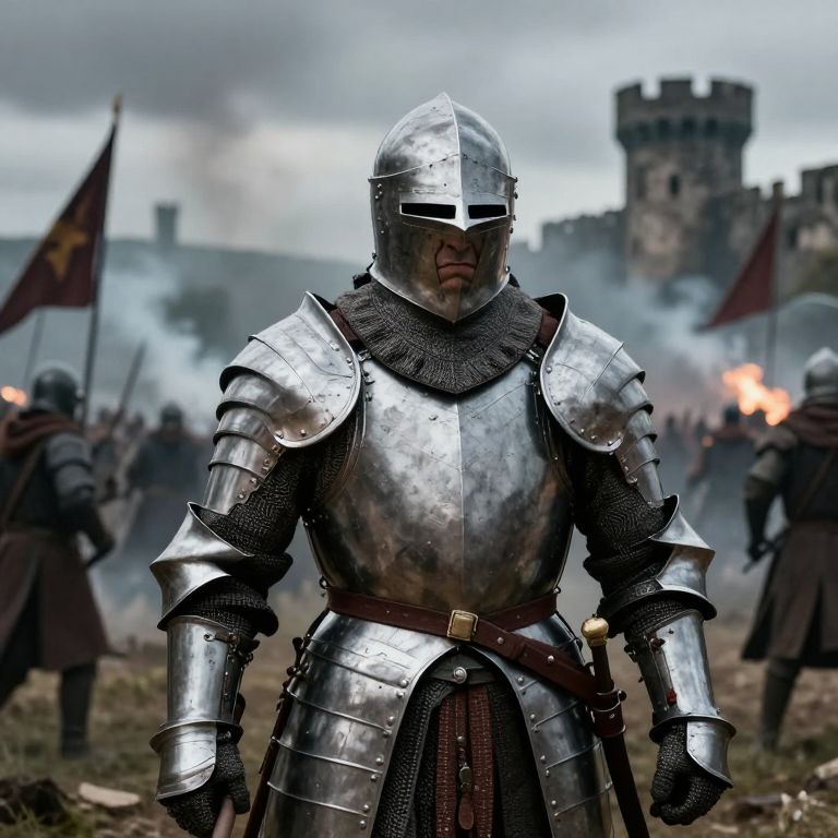 A photograph of a rugged man with a fair complexion, wearing a weathered, silver steel helmet with a narrow eye slit, and a dark green military-style jacket with brown straps. His facial hair is short and dark. The background shows a battlefield scene with blurred, smoke-filled air and flags, indicating a medieval or historical battle setting. The man's intense gaze is focused straight ahead, and the helmet's texture is speckled with raindrops. The overall color palette is muted with grays, greens, and browns.