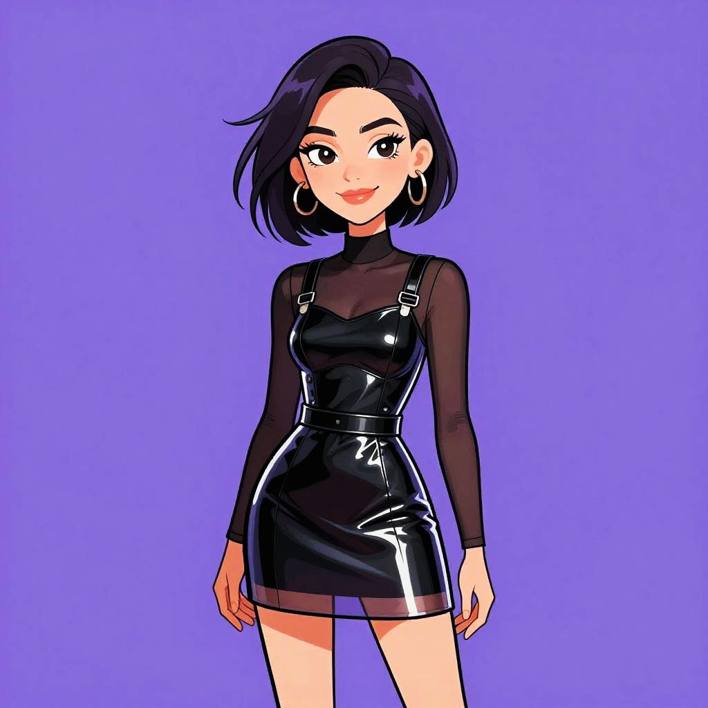 This is a digital anime-style illustration of a young woman with fair skin and short, sleek black hair. She has large, expressive eyes with dark eyeliner and is smiling slightly. She is wearing a black, shiny, latex mini-dress with long sleeves and a sheer black mesh top underneath. The dress has silver strap details. She also has large silver hoop earrings. The background is a solid, vibrant purple, making her black outfit stand out. The overall style is bold and colorful, with a focus on clean lines and a modern, edgy aesthetic.