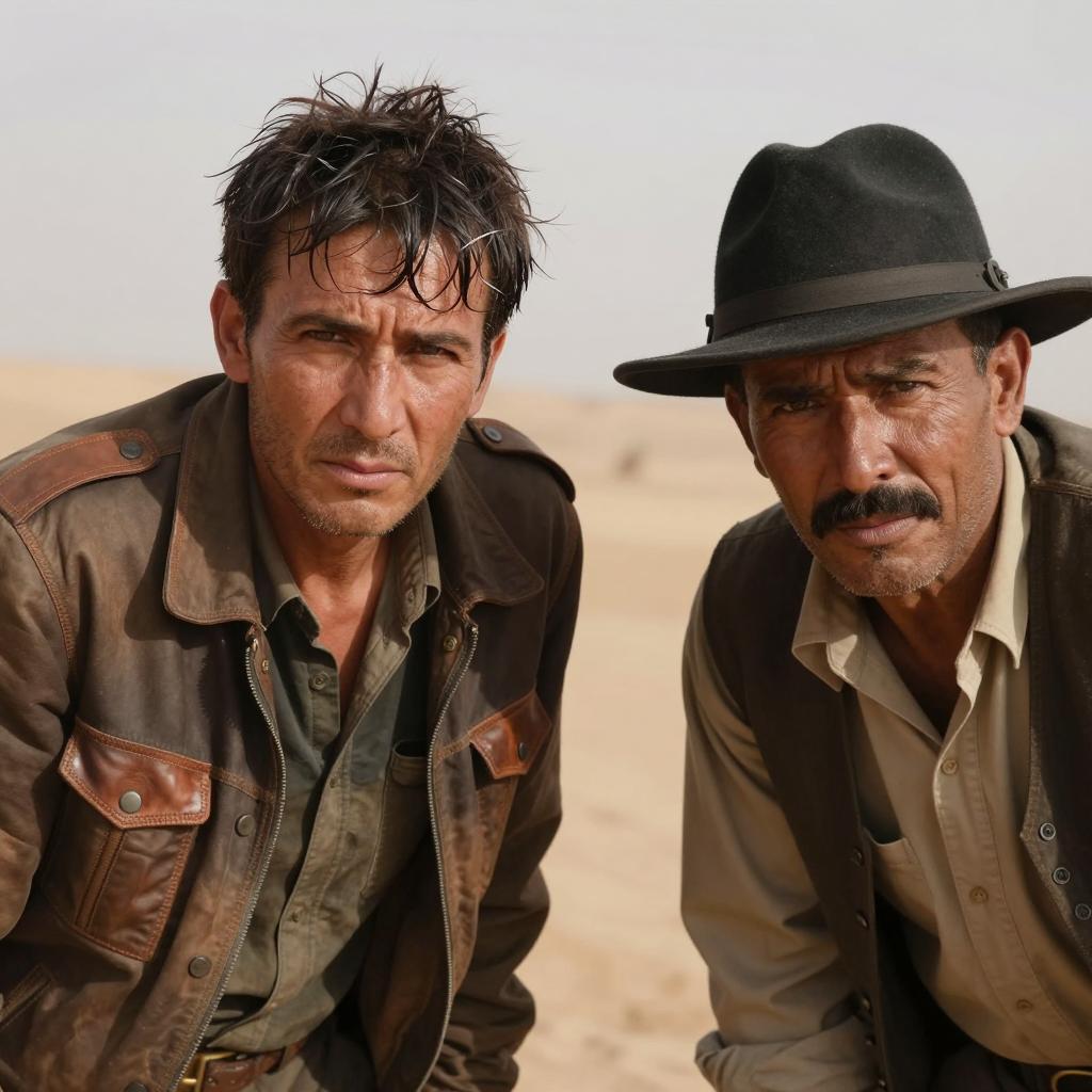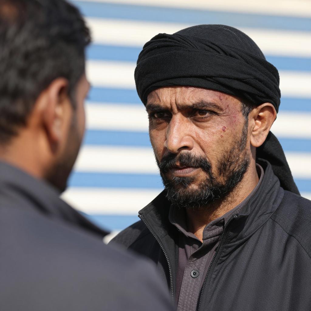 A close-up photograph of a middle-aged man with a black headscarf, dark beard, and mustache, looking intently at another person. He has a scar on his forehead and wears a dark, ured jacket. The background has blue and white striped shadows. The man on the left is partially visible, facing the man with the headscarf. Two people, focused interaction, intense expression.