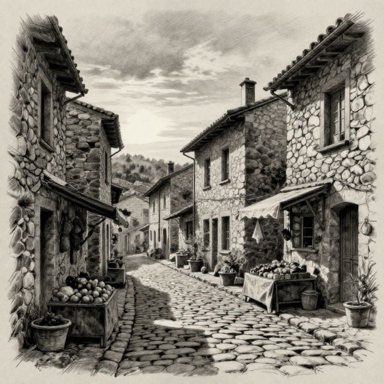 Sketch prompt of an old European village street, cobblestone paths winding between rustic stone houses, charcoal shading emphasizing texture and age, small market stalls with fresh produce, an atmospheric sunset casting long shadows across the scene.