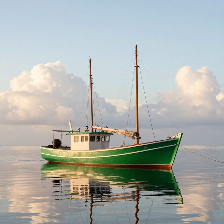 Serenely anchored fishing boat with two tall masts and a vibrant green hull floats calmly on tranquil waters, its reflection mirrored perfectly beneath, under a soft sky dotted with fluffy clouds.