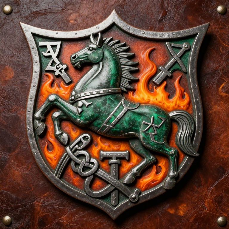 Viking family crest depicting a galloping horse intertwined with knot designs and Norse symbols, aged leather and iron elements combined with fiery orange and deep green hues, evoking the spirit of ancient Viking tribes and their fierce loyalty.