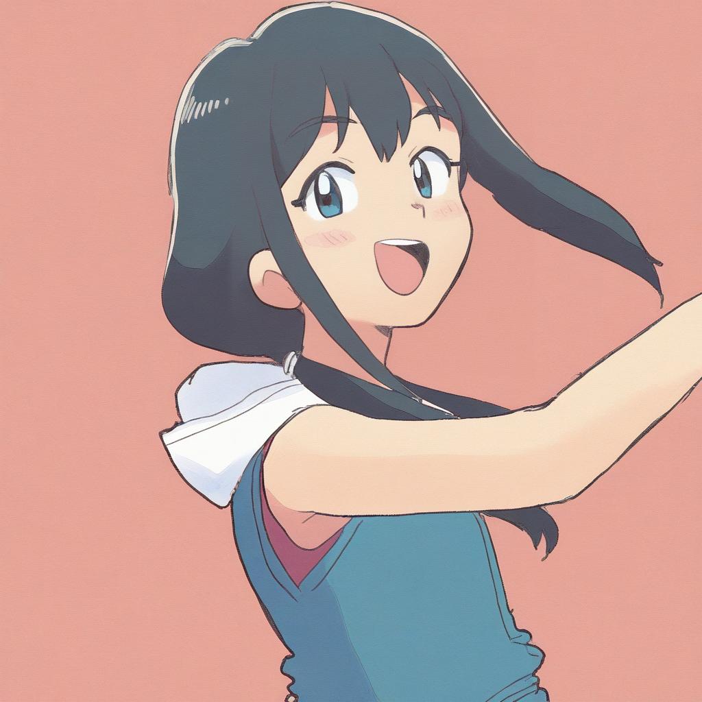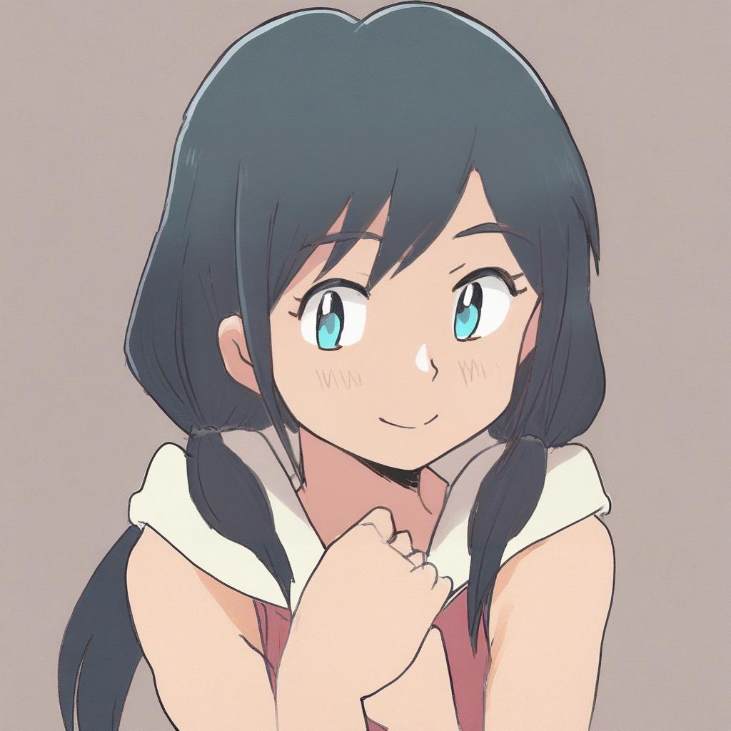 Digital illustration of an anime girl with black long hair styled in low twintails, bright blue eyes, and a sleeveless jacket with a hood down. The character has bare arms and a subtle smile, set against a muted background. Inspired by the style of Amano Hina from Tenki no Ko.