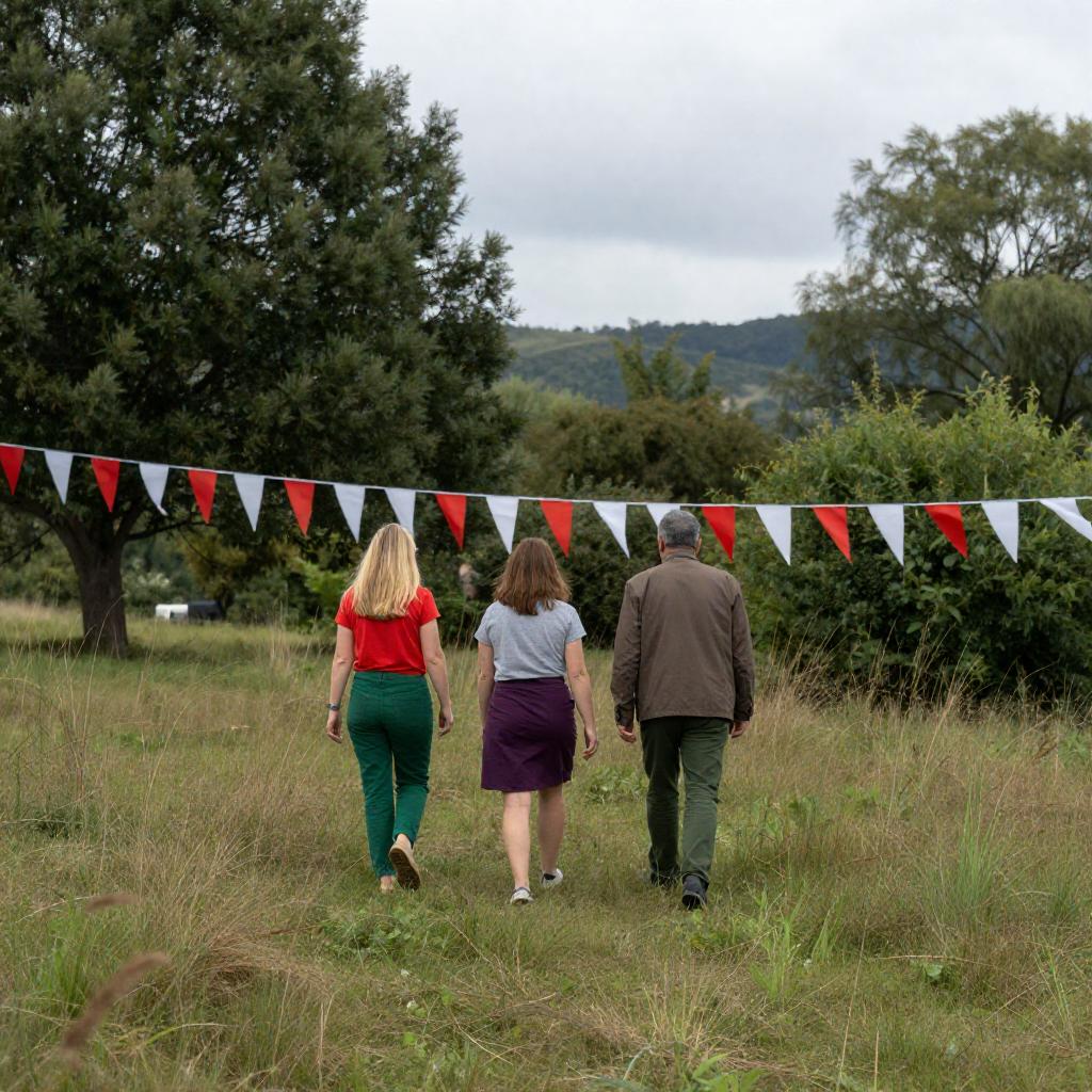 Photo of three individuals walking on a grassy hill surrounded by dense green trees and bushes. Two women with blonde hair are visible from the back; one wearing a red shirt with green pants, and the other in a gray shirt with a purple skirt. A man accompanies them wearing a brown jacket and green pants. Overhead, a string of red and white triangular flags stretches across, set against an overcast sky with distant hills in the background.