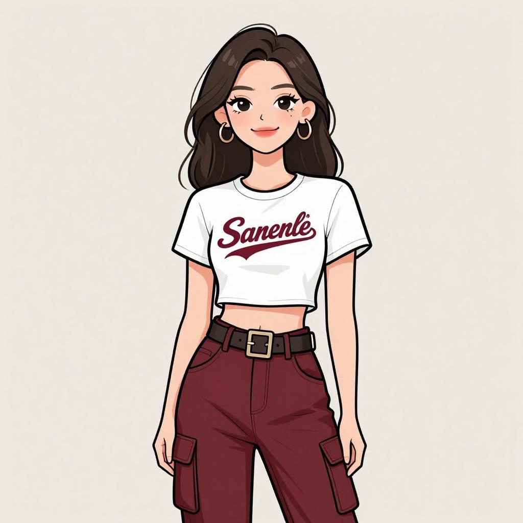 Woman with pretty face and pretty hair. smiling Woman, casual streetwear, cropped white graphic t-shirt, high-waisted maroon cargo pants, wide belt with a large square buckle, pants with side pockets and cuffed hems, plain background. --sref 1467