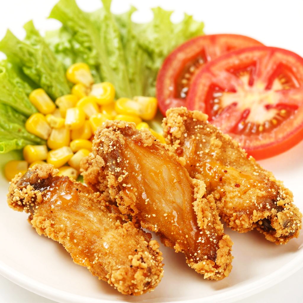 Close-up photograph of crispy, golden-brown fried chicken pieces, surrounded by vibrant lettuce, corn, and a slice of fresh tomato.