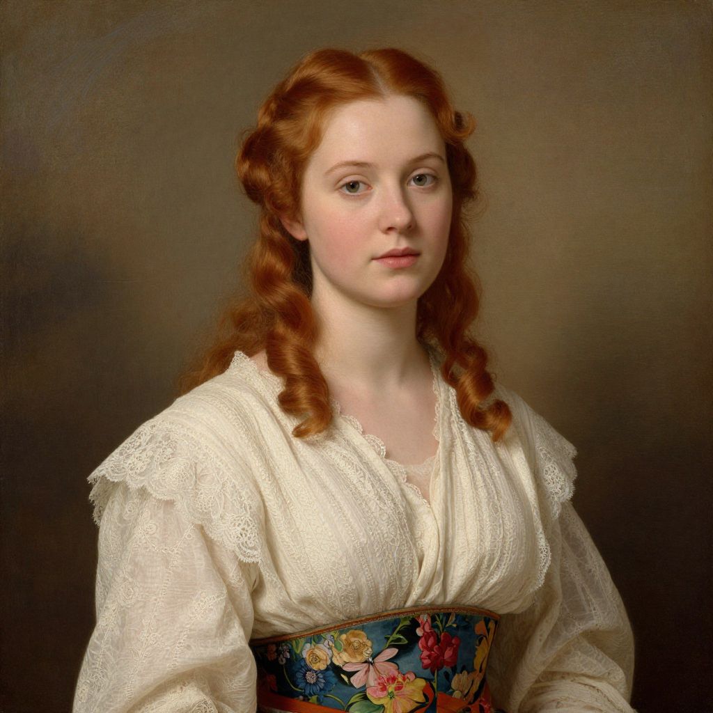 Woman portrayed in a classical painting style, featuring vibrant red hair styled in soft curls, wearing an elegant cream blouse with lace detailing and a floral-patterned waistband, set against a textured background of muted earth tones.