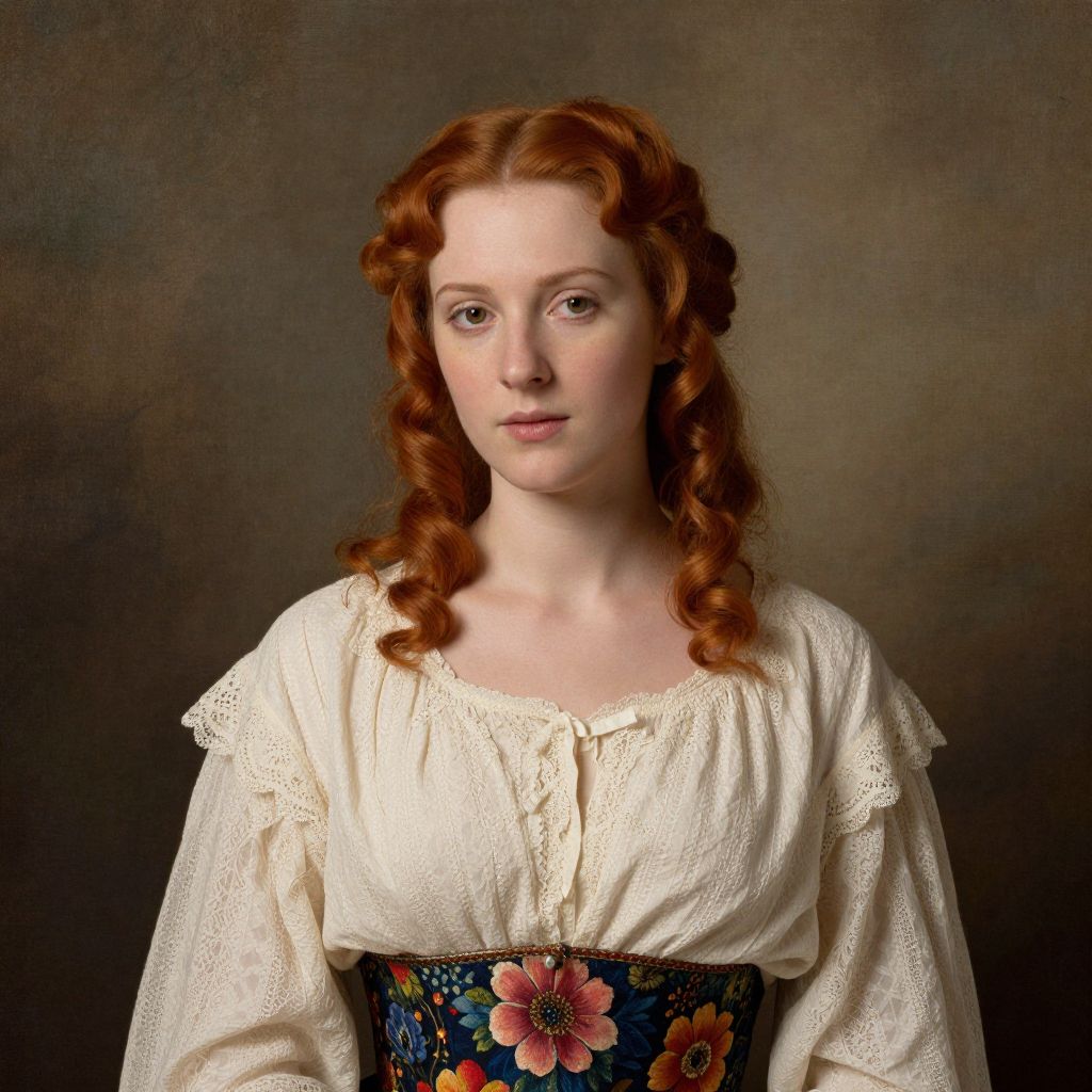 Photograph of a fair-skinned woman with red, curly hair styled in loose ringlets. She has a calm, expressionless face with light brown eyes and subtle pink lips. She wears a cream-colored, lace-trimmed, long-sleeved blouse with a low neckline, and a dark blue corset adorned with large, colorful floral patterns. The background is a muted, textured gray, which contrasts with her pale complexion and vibrant hair. The overall style is reminiscent of 19th-century portraiture, focusing on detailed clothing and gentle expressions. The lighting is soft, highlighting her face and hair.