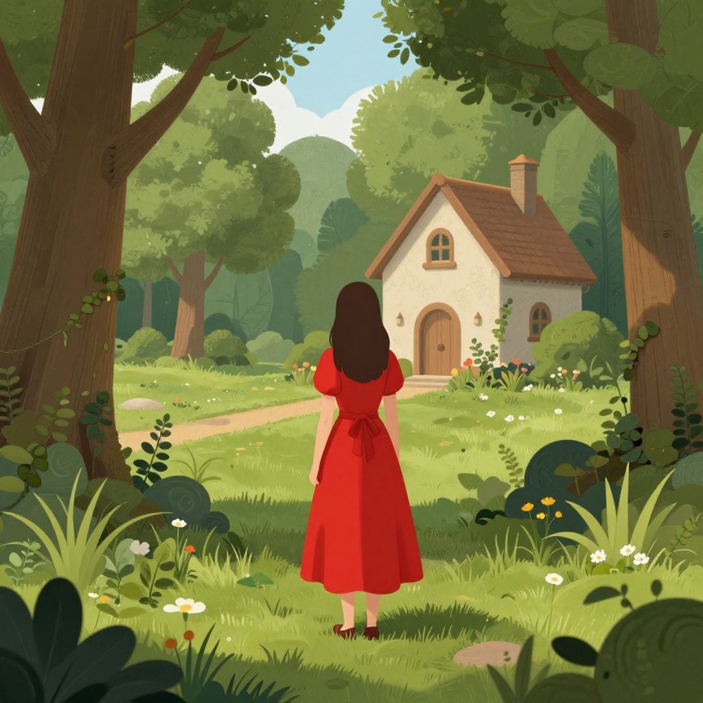 A serene digital illustration depicts a woman in a vibrant red dress standing amidst lush greenery, gazing toward a quaint cottage nestled between towering trees, evoking a tranquil, fairy-tale-like atmosphere with its high-definition details and soft, natural lighting.