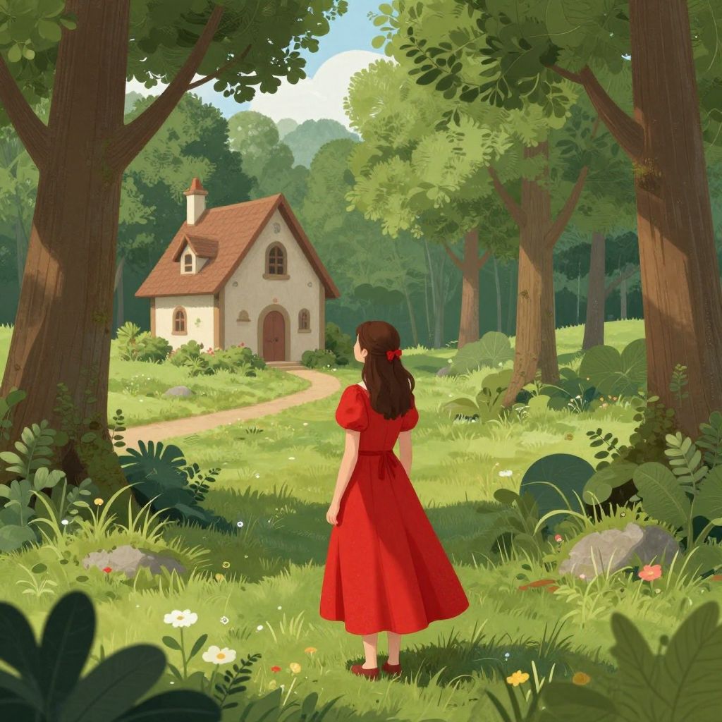 Digital illustration of a young girl with long brown hair, wearing a bright red dress and black shoes, standing in a sunlit forest. She faces a small, quaint, white cottage with a brown roof, surrounded by lush greenery, flowers, and tall trees. A winding path leads to the cottage. The sky is clear blue, and sunlight filters through the trees, casting shadows on the grassy ground. The scene exudes a whimsical, fairy-tale-like atmosphere.
