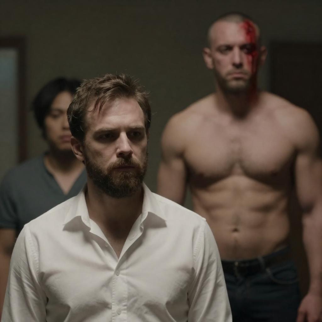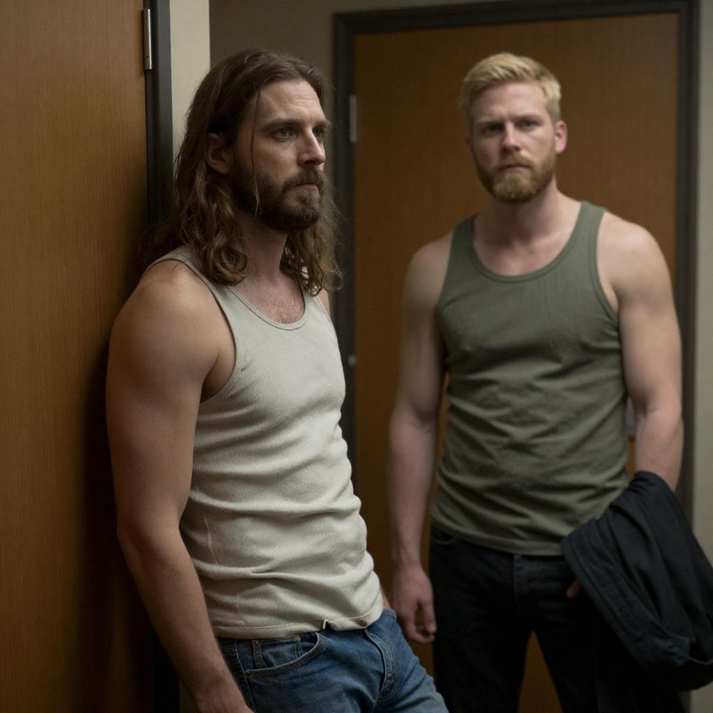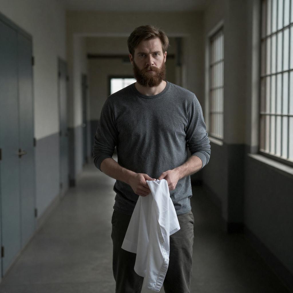 Photograph of a bearded man with brown hair, wearing a gray long-sleeve shirt and pants, standing in a dimly lit, industrial hallway. He holds a white shirt in his hands, looking serious. The hallway has metal doors on the left and barred windows on the right, casting shadows.