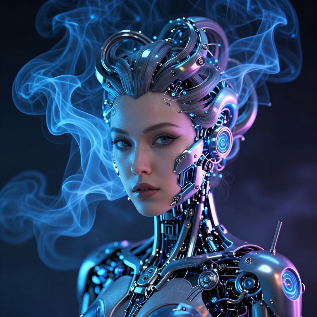 The image depicts a highly detailed, futuristic scene featuring a woman with a robotic appearance. Her face is adorned with intricate, glowing mechanical components, emitting a mesmerizing blue smoke effect that adds a surreal, psychedelic touch to the composition. The woman's hair is styled in an elaborate, twisted fashion, integrated seamlessly with the mechanical elements. The background is dark, allowing the vibrant colors and intricate details of the woman's robotic features to stand out prominently. The overall composition is dynamic, with the woman positioned centrally, her mechanical components and smoke effects creating a sense of depth and movement. The interplay of light and shadow, along with the reflective surfaces, enhances the hyper-realistic and futuristic aesthetic of the image.