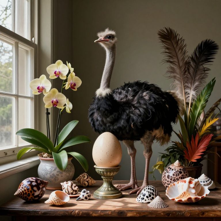 Incorporate the essence of Dutch Golden Age painting with a contemporary twist in an elaborate still life composition. A majestic ostrich egg rests atop a pedestal, surrounded by lush botanicals such as delicate orchids, exotic feathers, and an assortment of curious, intricately patterned shells. The scene is illuminated by natural light streaming through a large window, casting intricate shadows across the objects. This captivating arrangement evokes feelings of wonder, admiration, and curiosity while embracing the rich textures and vibrant colors reminiscent of a 17th-century masterpiece, yet reimagined in a modern, whimsical context.