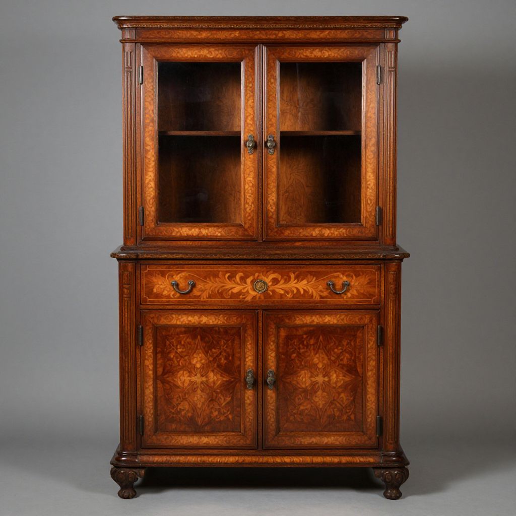Elegant 19th-century inlaid rosewood etagère showcasing intricate marquetry details, featuring two glass-paneled doors above three drawers and two cabinet doors below, all supported by ornate bracket feet.