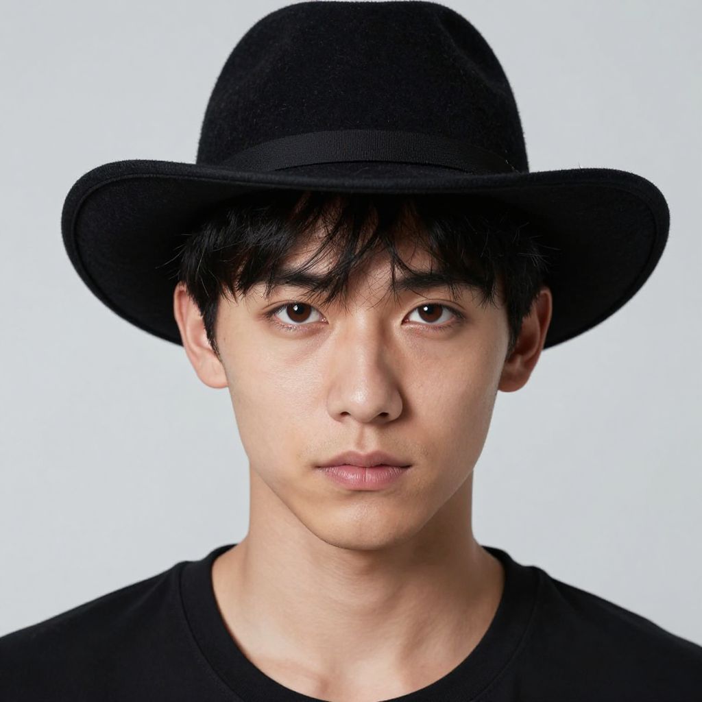 Photograph of an Asian male with fair skin, short black hair, and brown eyes. He wears a black wide-brimmed hat and a black t-shirt. His expression is neutral with a slight hint of seriousness. The background is a plain, light blue, which makes him stand out. The lighting is even, highlighting his facial features and the texture of his hat. The hat has a simple, classic design, and his hair slightly covers his forehead. The image is a head-and-shoulders portrait, focusing on his face and upper torso.
