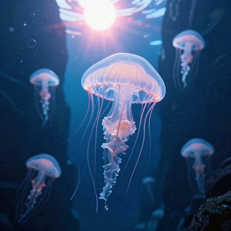 Giant, translucent jellyfish float serenely in a surreal underwater canyon, their pulsating bodies casting mesmerizing light patterns as they drift beneath a radiant, otherworldly sun, evoking a dreamlike, cyberpunk-inspired digital art aesthetic.