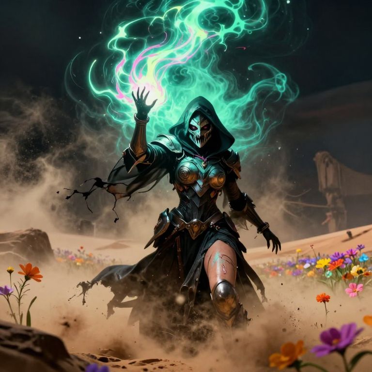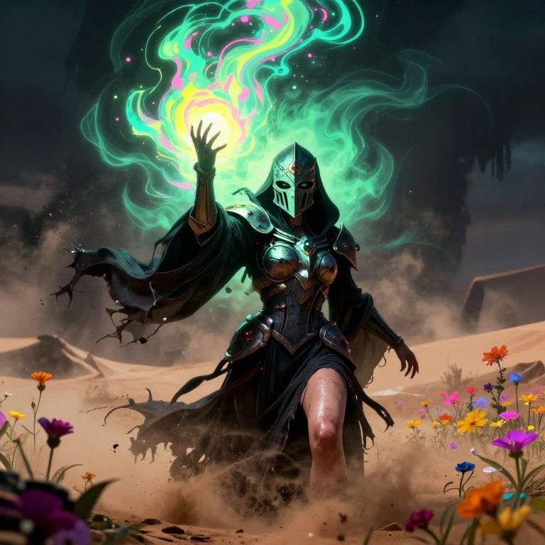 Action Pose Upper Body Shot, sftsrv style illustration, Yellow Green pink Neon Pop-Art, simplified, action Scene, bold lines, a Closeup Portrait of an eerie inspired hkmecha intricate designed knightess helmet, very detailed outworn helmet, shaded eyes, eye-trails, Vibrant Colorful Realistic analog photo, photorealistic, extreme closeup Face Portrait, extreme face closeup, head focus, Realistic analog photo, photorealistic, atmospheric lighting, volumetric lighting, cinematic, Epic Film Quality, A buxom witch stands in the midst of a ferocious DARK sandstorm amidst a Desert night, her tattered robe barely clinging to her body, revealing glimpses of her sweat-slicked skin, With one hand raised, she conjures a colossal, ancient vibrant black negativ luminous light spell from the swirling dust, its ethereal ghostly form towering above, terrifying and awe-inspiring, The hkmagic witch’s face is shrouded in the shadows of her hood, adding an air of dark mystery, The colorful Flower meadow landscape around her is cloaked in a dusty, dystopian atmosphere, with the sun obscured by the storm, The only light breaking through the chaos is the glowing DARK turquoise and pink aura of her powerful spell, casting an eerie illumination over the scene