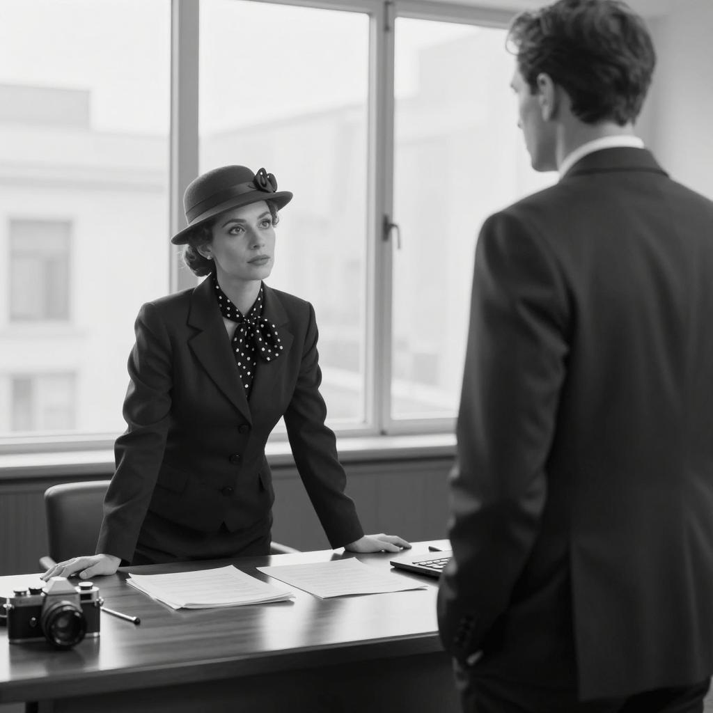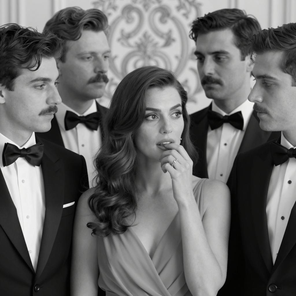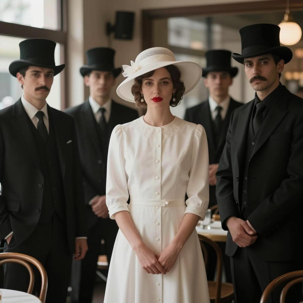 Black and white photograph of a crowded scene. Central female figure with fair skin, dark hair in an updo, wearing a puffed-sleeve dress with floral patterns. Surrounding men in various hats, some with bow ties, intense facial expressions. Crowd tightly packed, some looking at the central figure, others away. Hats in various styles, some with feathers. Dim, shadowy lighting. Several hands reaching towards the central figure.