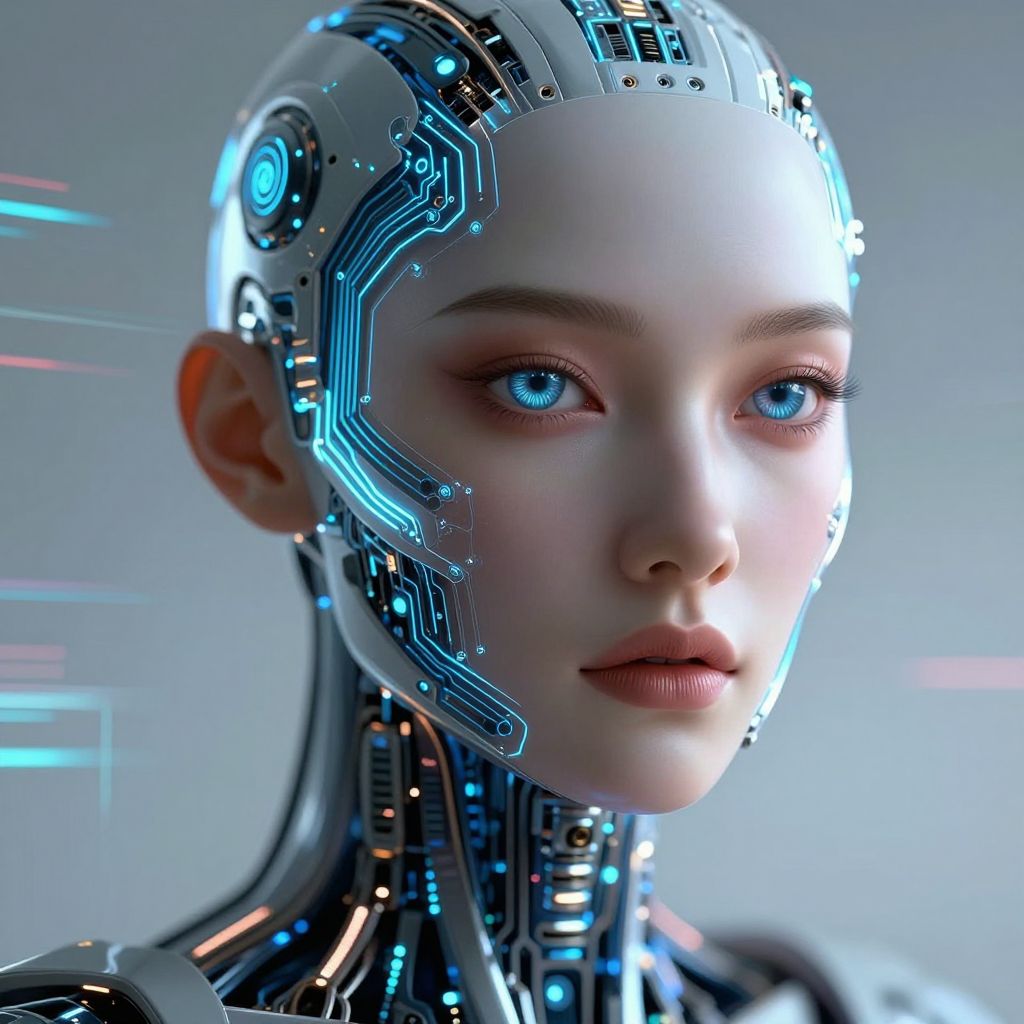 Barbie AI in a futuristic cybernetic world, neon lights reflecting off her sleek robotic skin, intricate circuitry glowing beneath a stylish pink outfit, digital butterflies fluttering around her, soft pastel background blending technology and fashion.