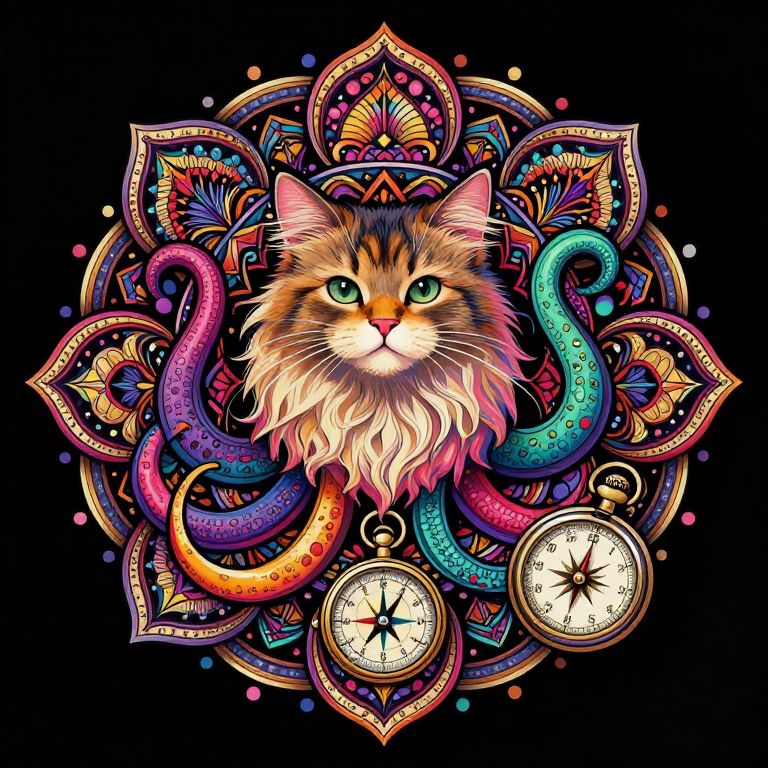 A vibrant, intricately designed mandala featuring a Persian cat with colorful tentacles, a compass, and a pocket watch, set against a black background.