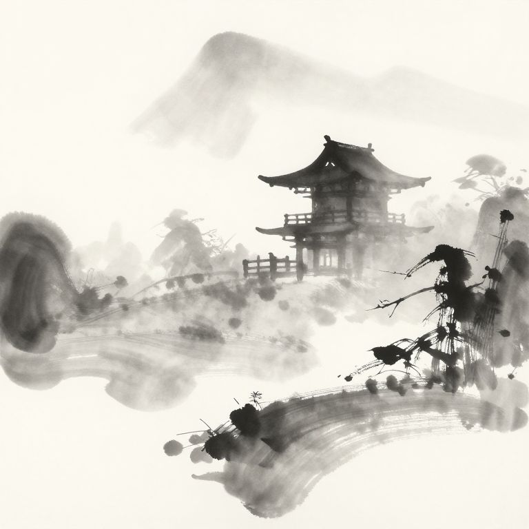 Black ink wash drawing of a traditional Japanese pagoda with misty, abstract surroundings, emphasizing minimalist, serene, and ethereal atmosphere.