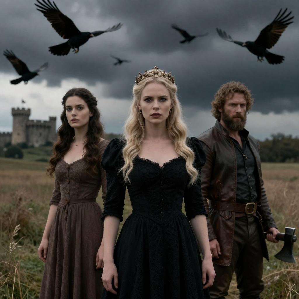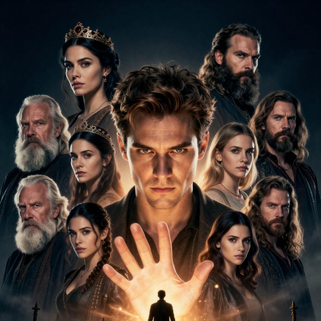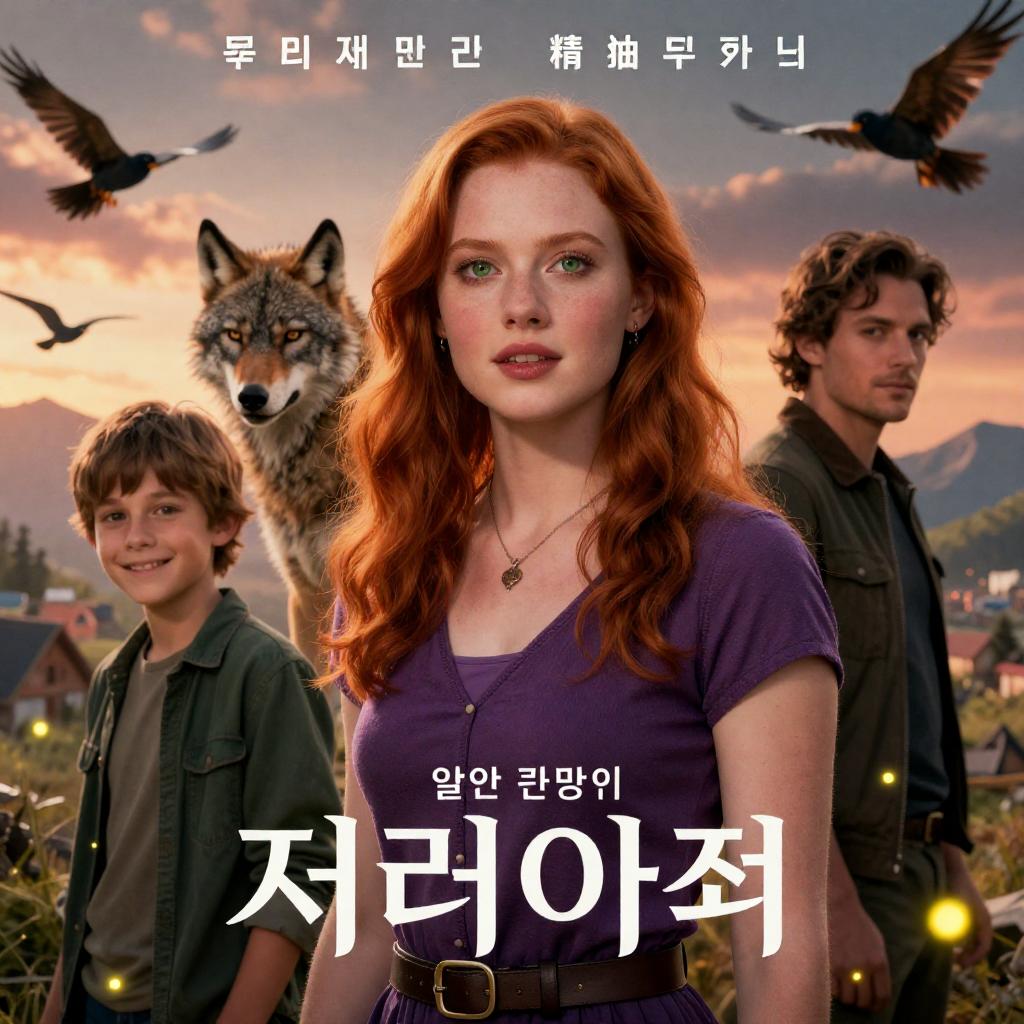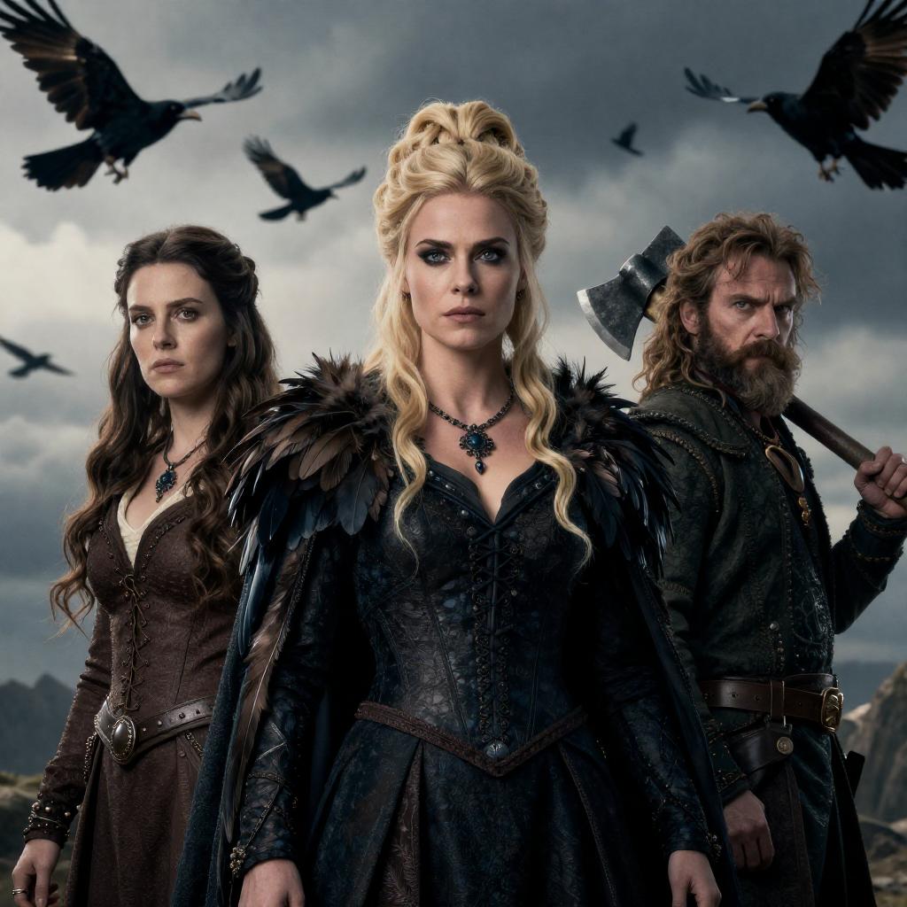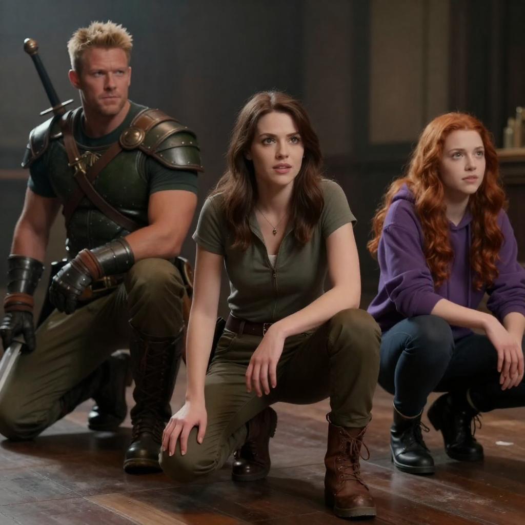 Photograph of five characters. Central figure is a gray, horned, wolf-like creature with a staff, fierce expression. To the right, a young man with brown hair, green armor, intense gaze. Bottom left, a red-haired woman with large eyes, surprised expression. Bottom right, part of a mountain, sunset. Birds fly around. Background transitions from blue sky to orange sunset. Characters are arranged in a triangular formation.