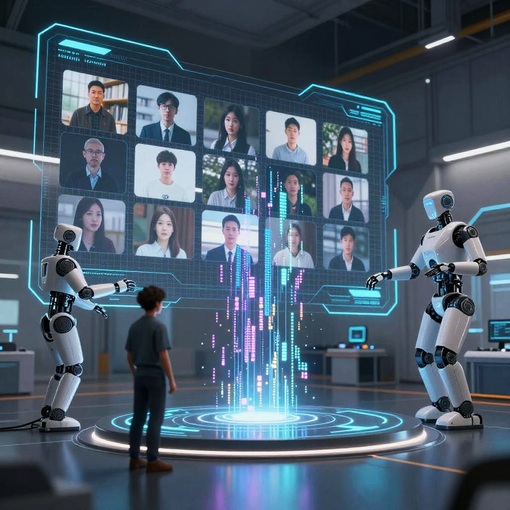 AI image generator training environment, virtual reality interface showing layered image synthesis, robots and humans interacting, dynamic flow of pixel data in the air, sleek design with neon circuits and digital grids, science fiction theme