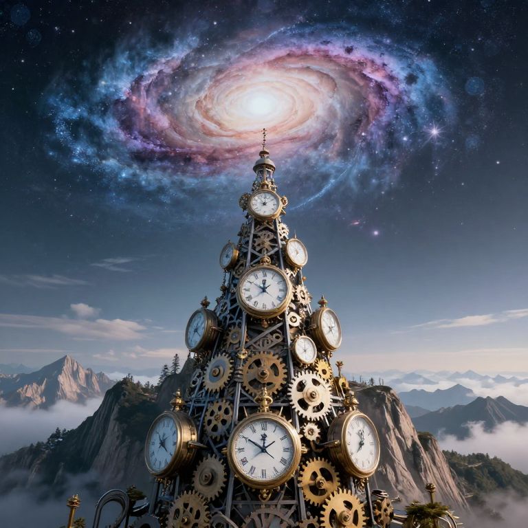 A towering mountain made entirely of suspended clocks and gears stretches into the sky, its apex dissolving into a swirling galaxy of frozen time.