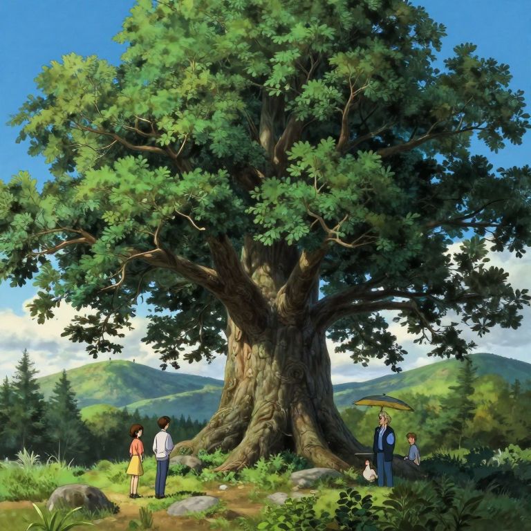 Digital painting of a large, lush green tree in a sunny meadow. Five people, three men and two women, stand and walk around it,