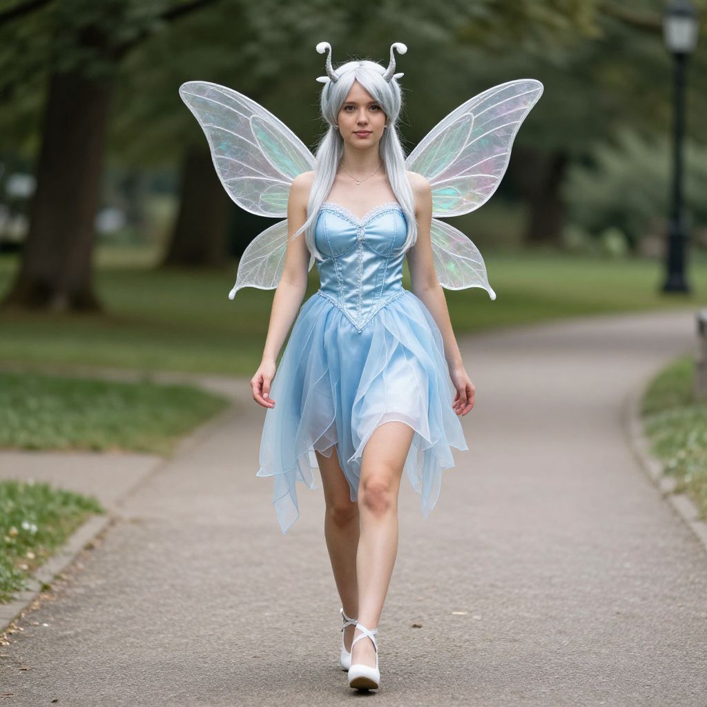 Photograph of a young woman with fair skin and long white hair, dressed as a fairy. She wears a light blue, sleeveless, tulle dress with a fitted bodice and a flowing skirt. She has transparent, iridescent wings with white and blue hues, and a white headband with small antennae. Her makeup is subtle, with pink lipstick. She walks confidently down a paved path in a park, surrounded by green grass and trees. She wears white high-heeled shoes. The background is slightly blurred, emphasizing her as the focal point. The image has a soft, slightly surreal quality.