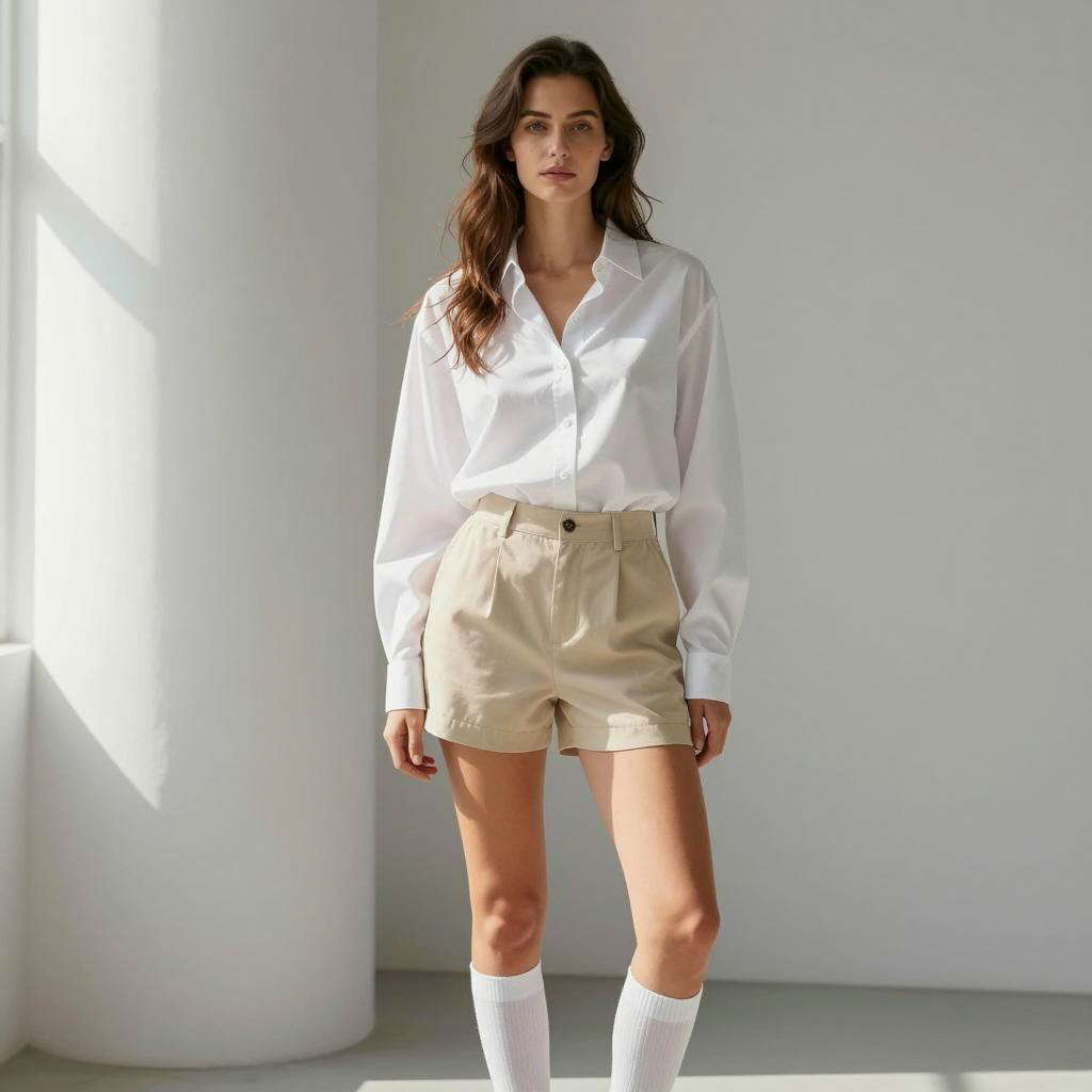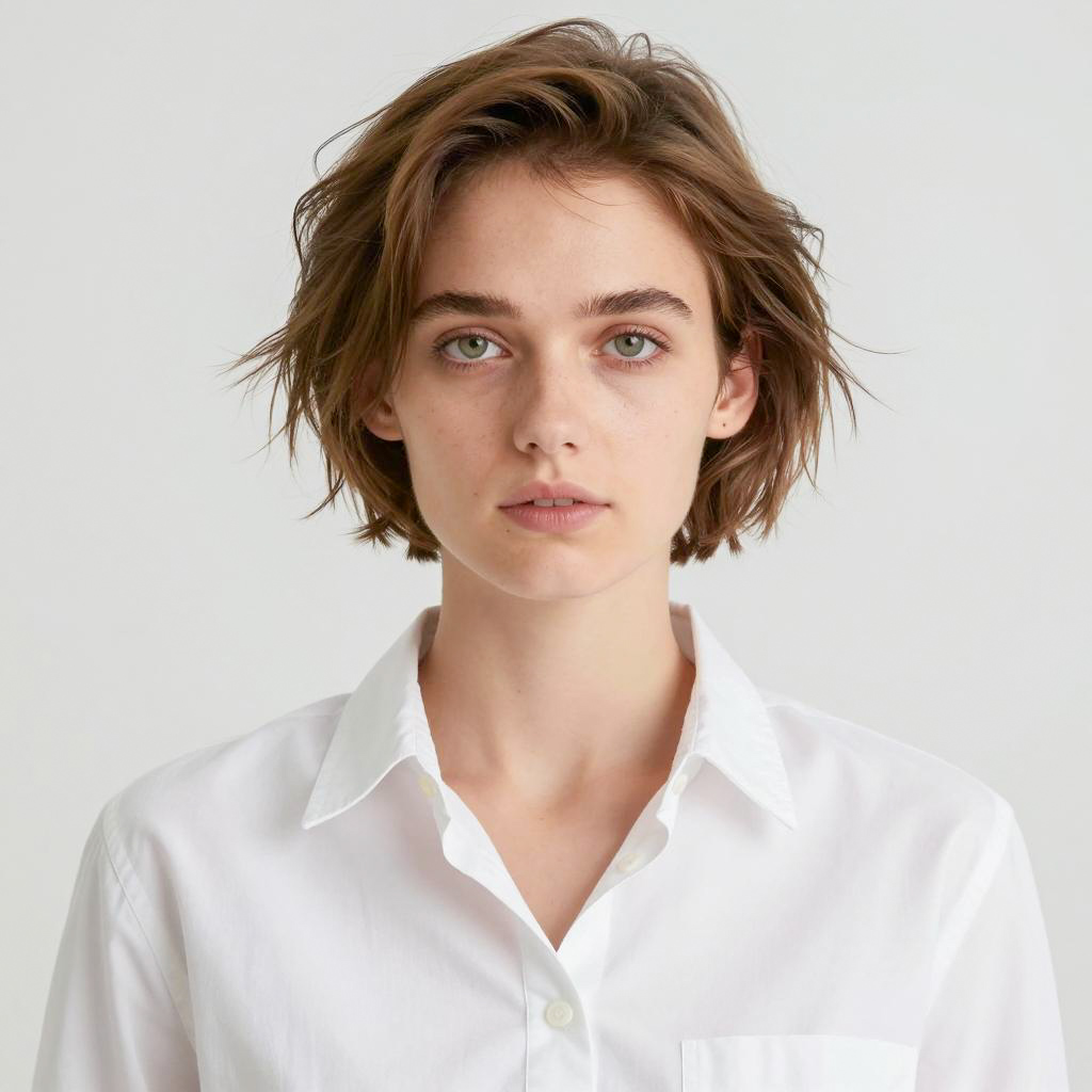 White dress sleeves, photorealistic portrait of a young woman, medium-length dark brown hair in a loose side ponytail, light skin tone, wearing a white, long-sleeved, high-neck dress with buttons and a cinched waist, standing against a softly lit, neutral-colored background, natural light from the right casting soft shadows, serious expression, minimal makeup, simple and elegant style, warm and subtle lighting, soft focus, slight bokeh effect in the background