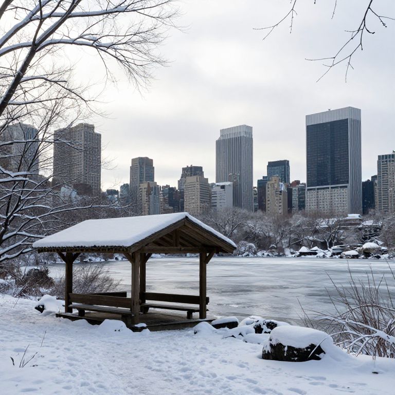 Snow-covered branches frame a tranquil view of Wagner Cove's wooden shelter, perched gracefully on a frozen lake in Central Park, with distant city skyscrapers silhouetted against a hazy winter sky.