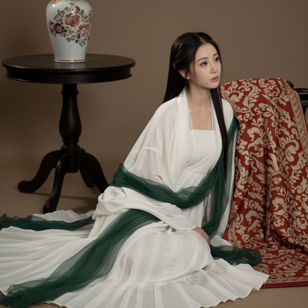 Photograph of an East Asian woman with fair skin and long, dark hair, sitting on a wooden floor. She wears a white, flowing, long-sleeved dress with a green shawl draped over her shoulders. Her expression is calm and slightly pensive. Behind her, a dark wooden table holds a decorative, floral-patterned porcelain vase with gold accents. A red and white patterned cloth is draped over the table's edge. The background is a plain, gray wall, contrasting with the rich textures and colors of the table and vase.
