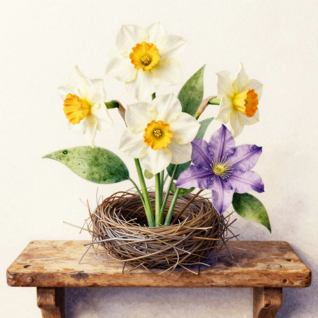 No humans, traditional media, painting (medium), oil pastel and chalk pencil, cabinet top with botanical specimens, botanical focus on yellow marigolds and lavender spikes, nature, green leaf details, warm yellow accents, soft natural light, textured paper surface, balanced composition, painterly brushwork, serene mood, gentle shadows, high detail petals and leaves, subtle background, cohesive color harmony