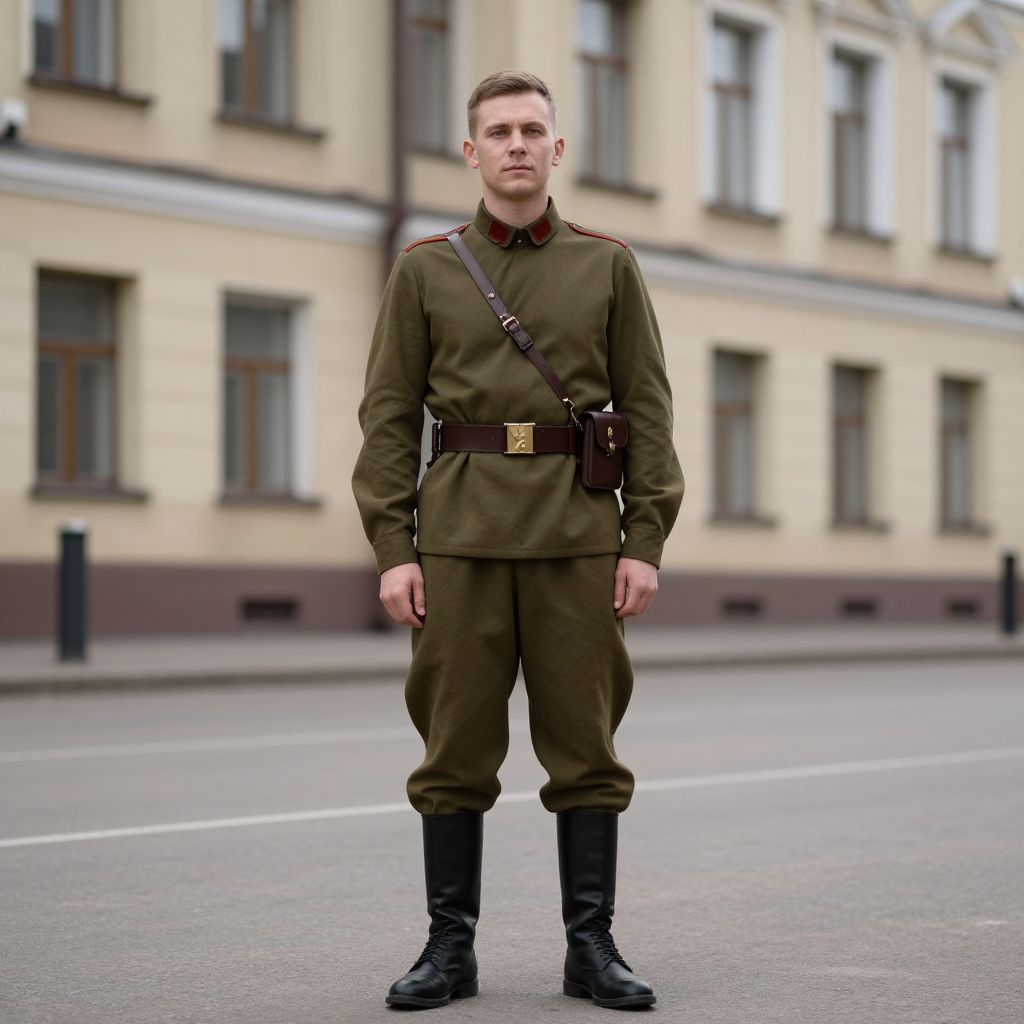 Soviet Uniform Costume, soldier in uniform standing in front of a building