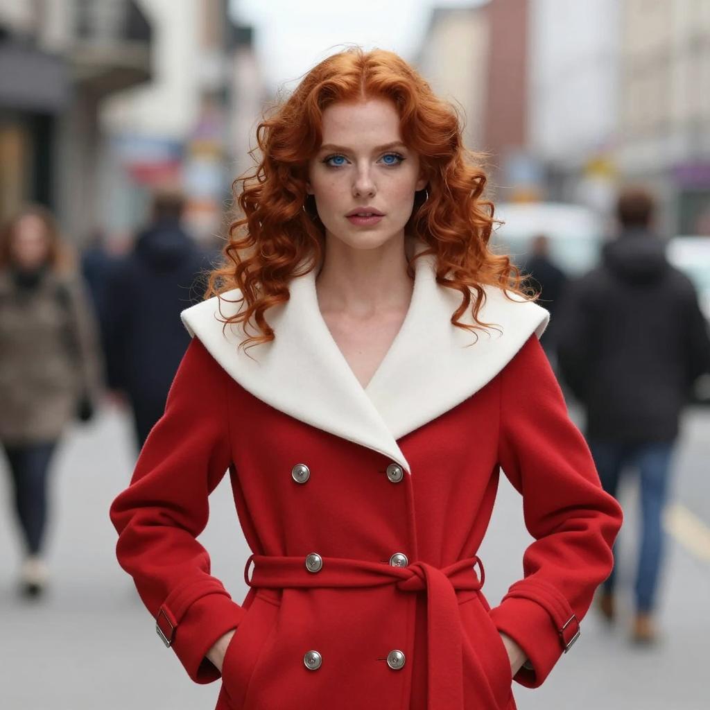 A woman with vibrant red curly hair and striking blue eyes poses confidently in a stylish red coat with oversized white collar and silver buttons. The scene is set outdoors in an urban environment with blurred figures and buildings in the background, emphasizing a modern and fashion-forward look.