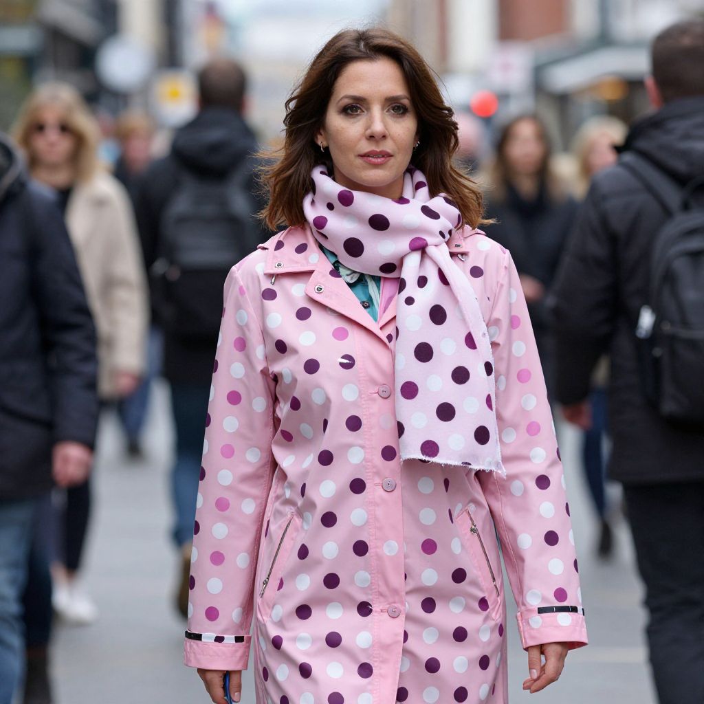 Pink Polka Dot Costume, woman in pink polka dot raincoat and scarf standing in a crowded street