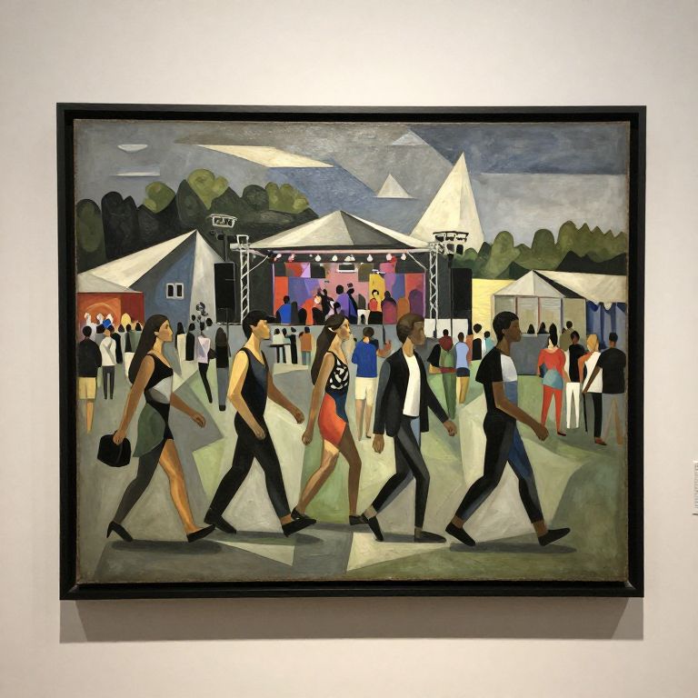 Walk Cycle cubism painting of an outdoor modern music festival, in a framed gallery, textured, chiaroscuro,