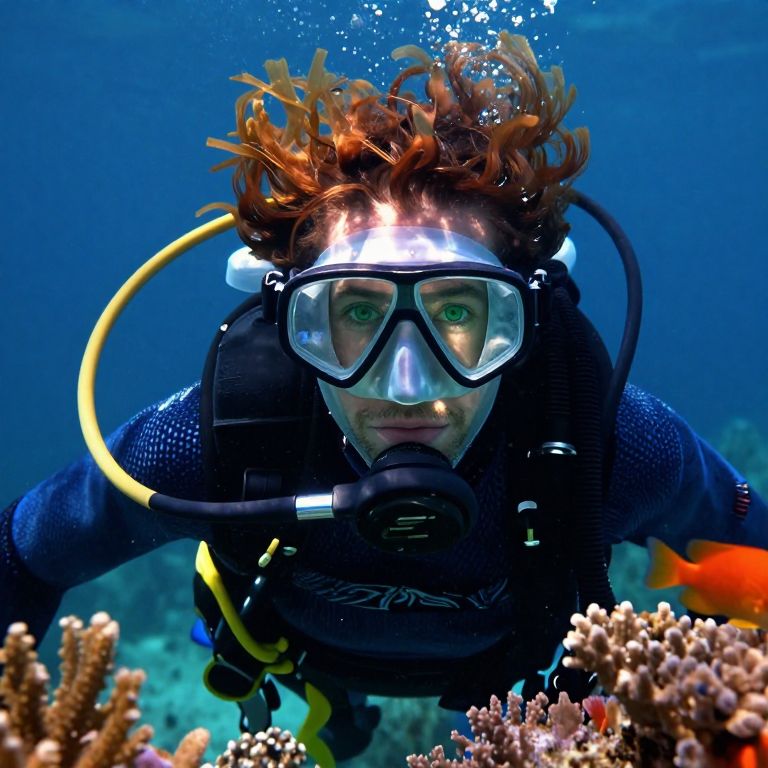Capture a captivating portrait of a deep-sea diver from an unconventional underwater perspective. The subject's intense green eyes and tousled chestnut hair, resembling seaweed, stand out. Dim blue light filters through crystal-clear water, accentuating their facial features, including subtle wrinkles and a hint of a smile. Sunlight streams in, illuminating the intricate texture of their wetsuit and reflecting off their goggles, creating an enchanting interplay of light and shadow. Vibrant coral and curious fish gracefully intertwine with the diver, adding an emotional depth to this ethereal scene that evokes both tranquility and adventure.