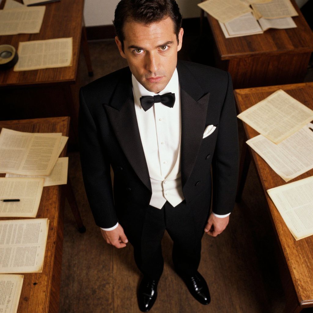 Photograph of a Caucasian man with short dark hair, wearing a black tuxedo with a white dress shirt and black bow tie, standing in a dimly lit room. He has a serious expression and is looking up at the camera. The background features wooden desks with scattered, yellowed papers and a pen. The lighting casts shadows, adding a dramatic effect. His black shoes are polished, and he has a white pocket square in his tuxedo's breast pocket. The overall style is reminiscent of film noir.