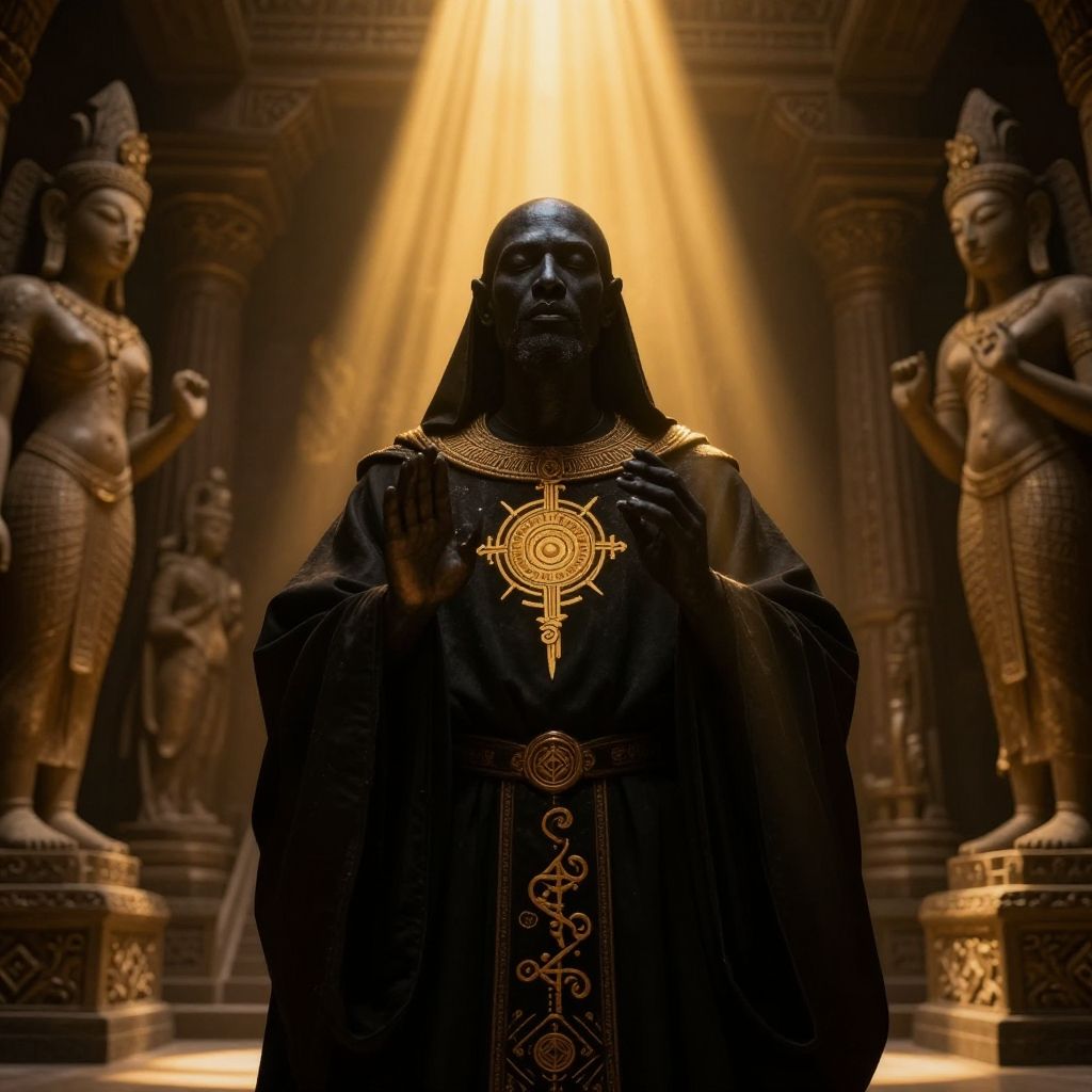 Photograph of a dark-robed, masked figure with intricate golden symbols, standing in a dimly lit temple with statues, bathed in radiant yellow