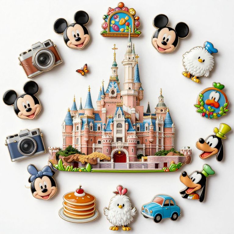 The image is a vibrant and whimsical mood board featuring a variety of Disney-themed pins arranged in a visually appealing manner. Central to the composition is a large, ornate castle, reminiscent of a fairy tale setting, surrounded by lush greenery and a butterfly. Surrounding the castle are numerous pins, each with its own unique design and color scheme. There are pins depicting characters such as Mickey Mouse, Goofy, and a fluffy white bird, as well as various objects like a camera, a stack of pancakes, and a small blue car. The pins are arranged in a somewhat circular pattern, creating a sense of harmony and balance. The overall color palette is rich and warm, with shades of blue, green, and brown dominating the scene. The textures range from smooth and glossy to more rugged and detailed, adding depth and interest to each pin. The spatial relationships between the pins are carefully considered, with some pins overlapping or positioned closely to create a dynamic and engaging visual experience.