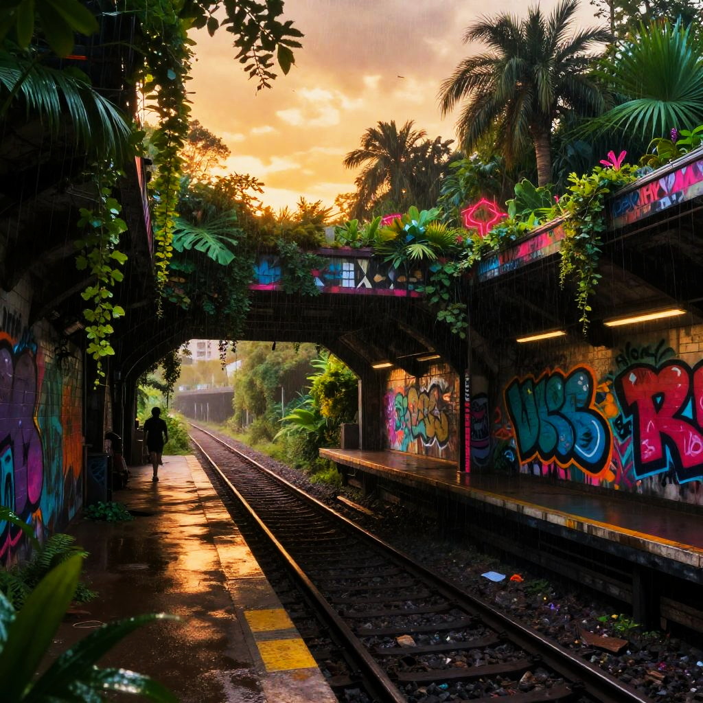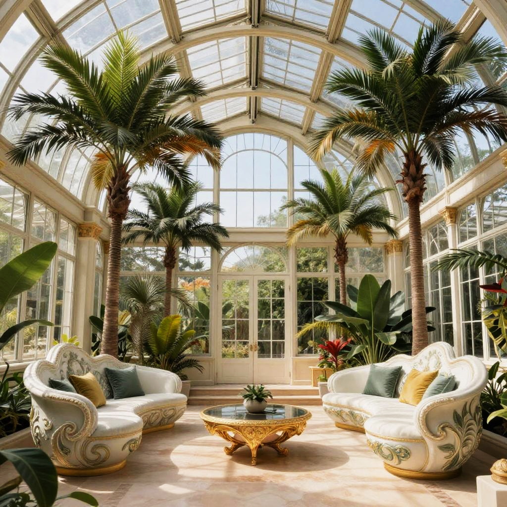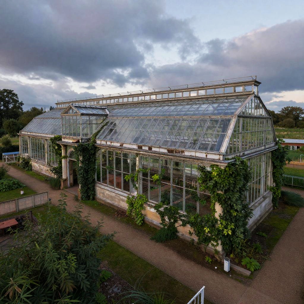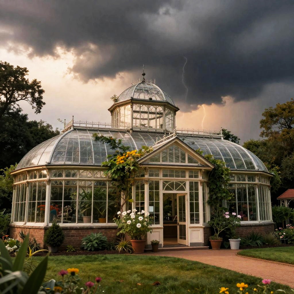 A overgrown Victorian greenhouse in the midst of a sultry summer thunderstorm during a warm summer evening. The scene radiates a vibrant color palette that exudes energy and excitement, currently trending on ArtStation, inspired by Simon Stålenhag and John Atkinson Grimshaw.