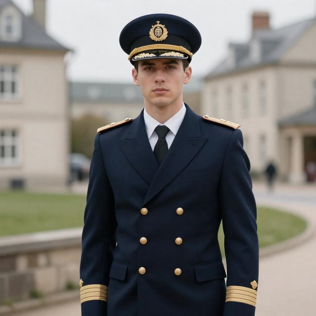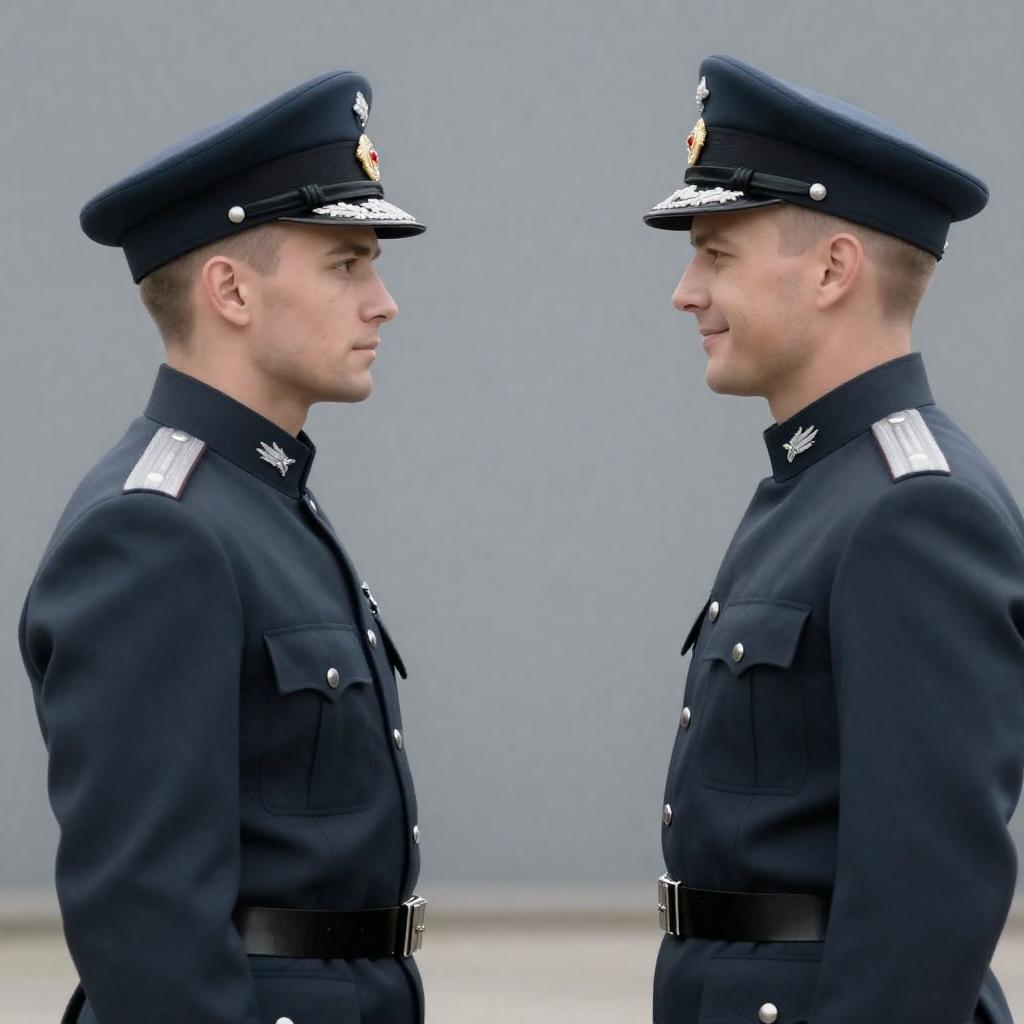 Photograph of two male military officers in dark uniforms with peaked caps, facing each other in profile. Both have light skin, one with short brown hair and the other with short blond hair. The background is a ured, gray wall. The officer on the right has a slight smile, while the one on the left looks serious. The uniforms have silver epaulettes and buttons.