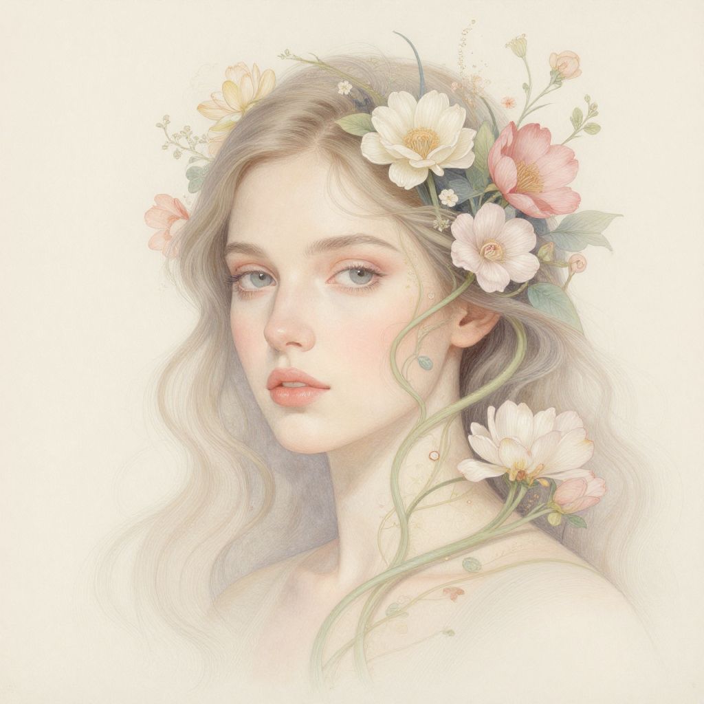 Flower hair painting, a surreal portrait of a woman with vibrant blossoms intricately woven through her hair, soft pastel colors, delicate brush strokes, impressionist style, detailed floral textures, dreamy ethereal background, high resolution