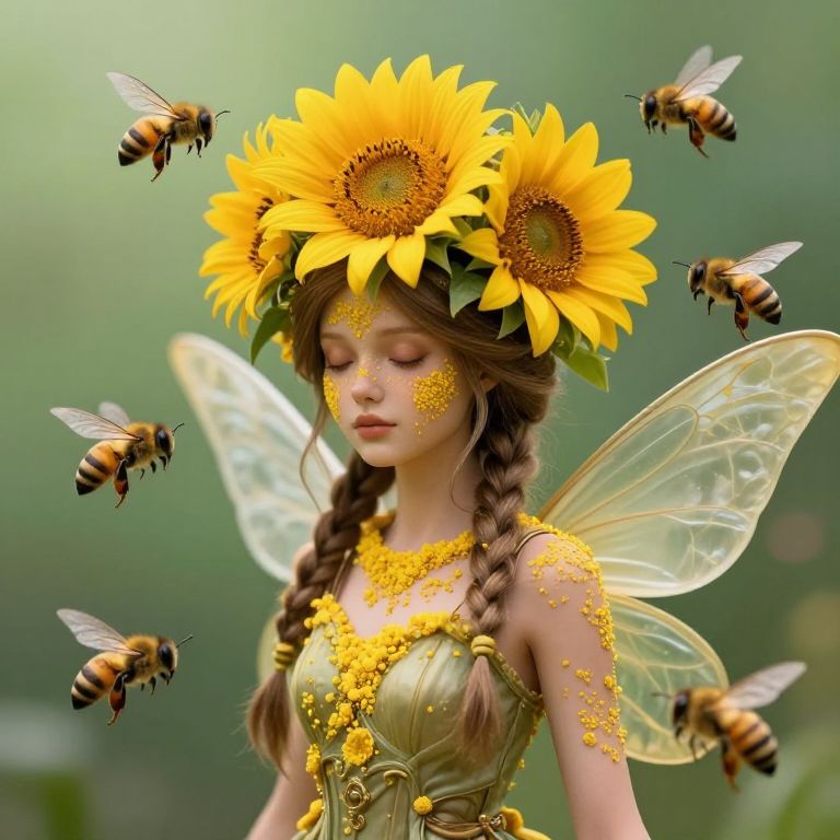 Digital art of a fair-skinned, young woman with closed eyes, golden-yellow dress adorned with pollen, and translucent fairy wings. She wears a sunflower crown with three large, vibrant sunflowers. Her brown hair is braided and she has yellow pollen on her cheeks. Surrounding her are six realistic honeybees with translucent wings. The background is a soft, green blur, suggesting a garden or forest. The overall style is whimsical and magical, with a focus on nature and bees. The woman's serene expression and the bright colors create a harmonious, enchanting scene.