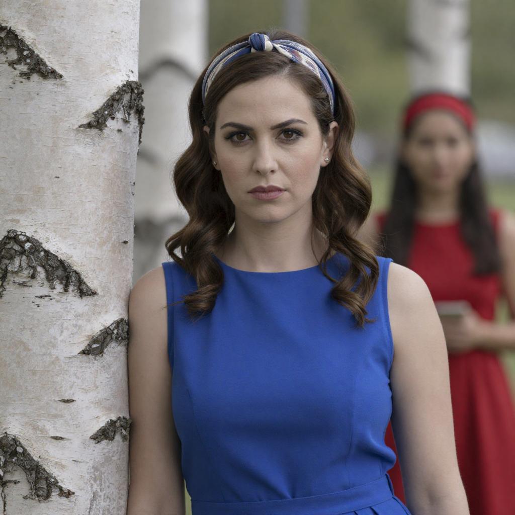 Photograph of a woman with curly brown hair, wearing a dark purple scarf and black handbag, standing against a red brick wall. She gazes to the left, holding a small object. White roses with green leaves are in the foreground to her left. Bright sunlight highlights her face and the flowers.